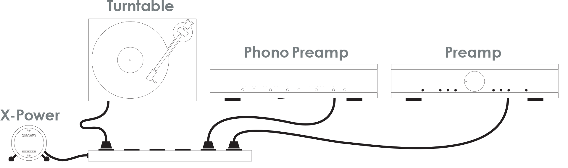 Analogue devices like turntables and phono preamps or preamps (devices that operate with and amplify low voltage signals) should always be kept separate from digital devices. Below exampl setup consists of turntable, phono preamp and regular preamp.